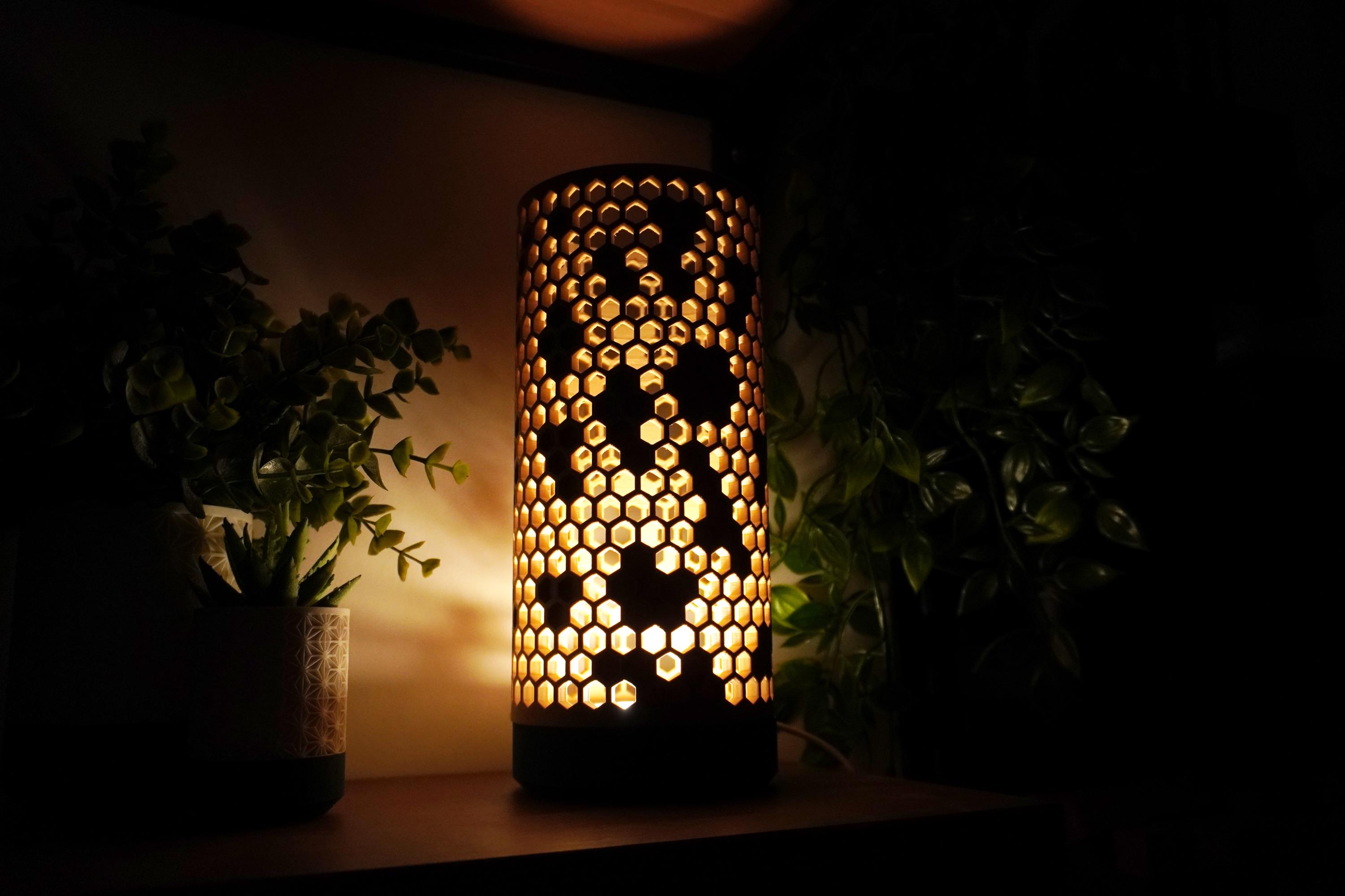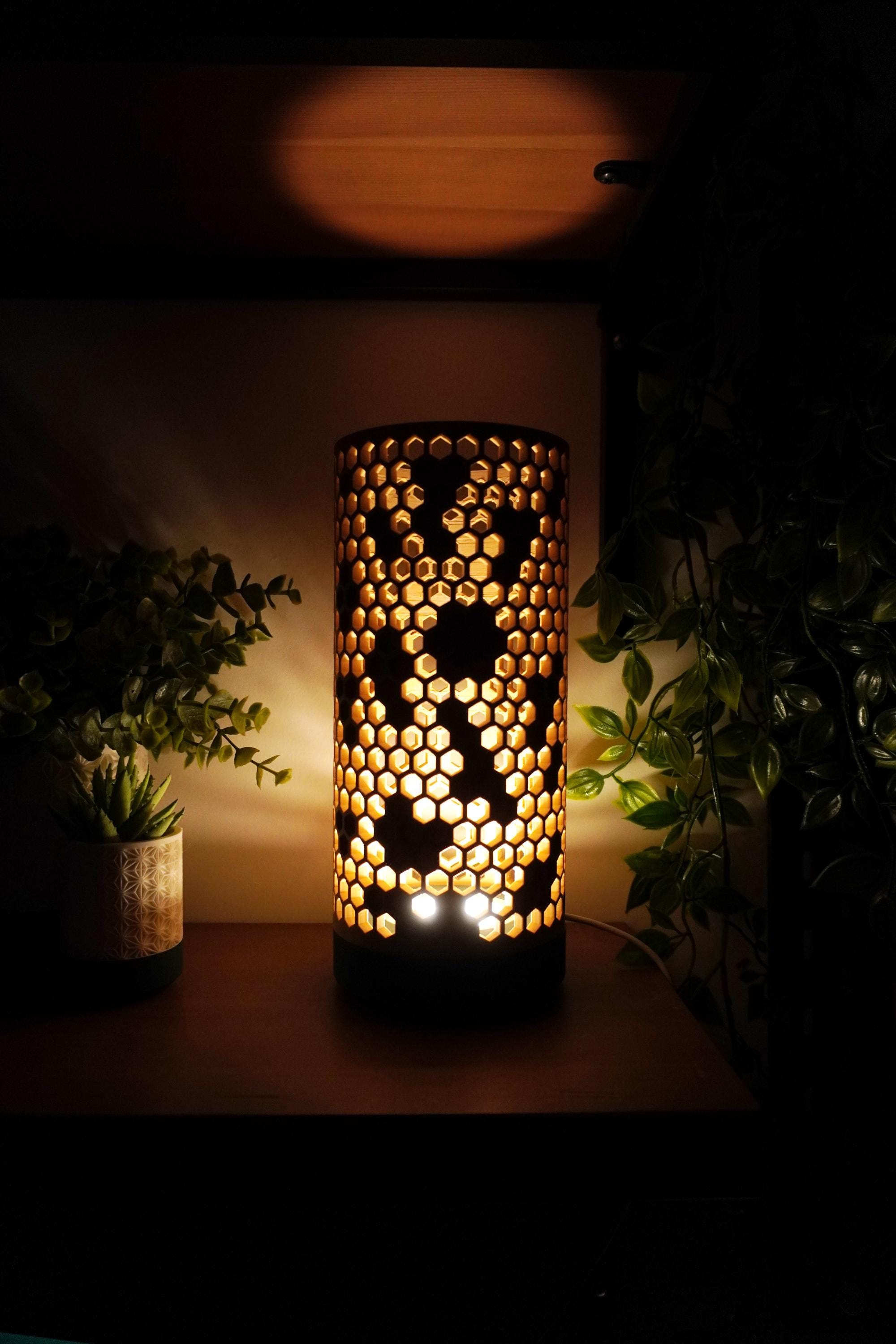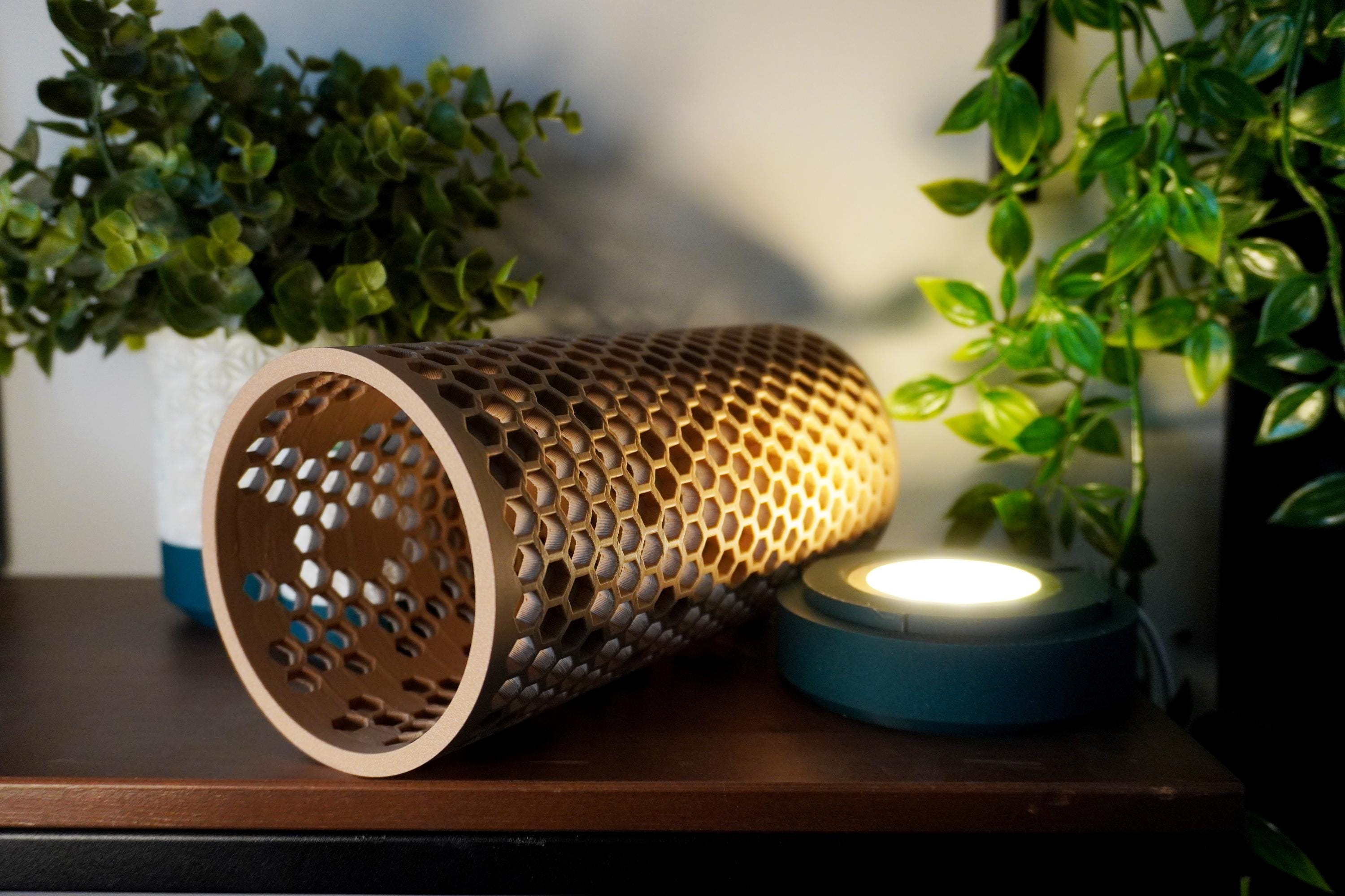 This 3D-printed LED lamp impresses with its unique honeycomb design, creating a mesmerizing play of light and shadow. Made from WoodPLA and PETG, it combines sustainable materials with modern technology.